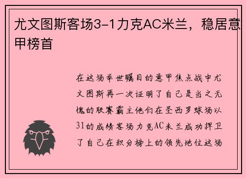 在这场举世瞩目的意甲焦点战中,尤文图斯再一次证明了自己是当之无愧的联赛霸主。他们在圣西罗球场,以3-1的成绩客场力克AC米兰,成功捍卫了自己在积分榜上的领先地位。这场比赛不仅是一场胜利,更是尤文图斯强大统治力的又一次体现。
